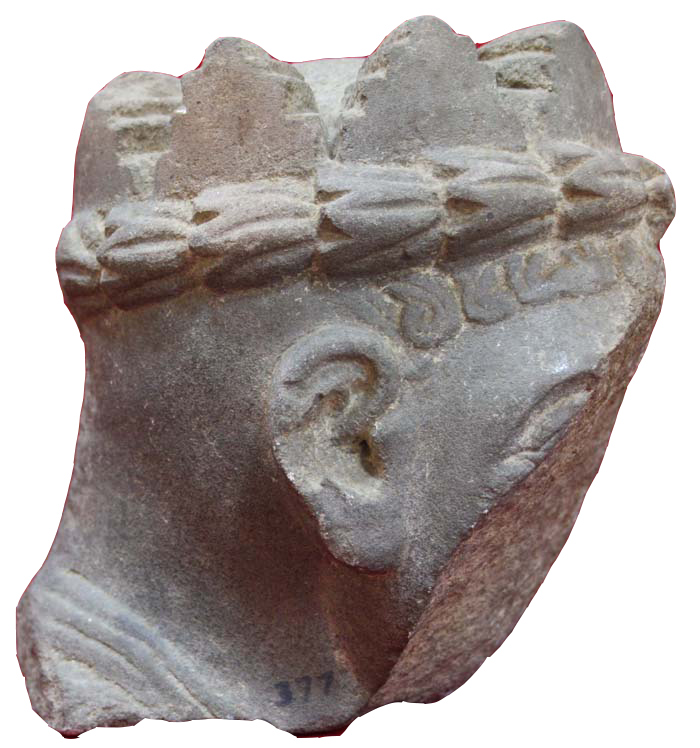 Object: Heads Material: Stone Date / Period: Mauryan, c. 3rd cent. B.C.E. Measurement: 18x16x20 cms. Description: Stone head witholive leaves crown on the head which shows its greek affiliation face damaged.