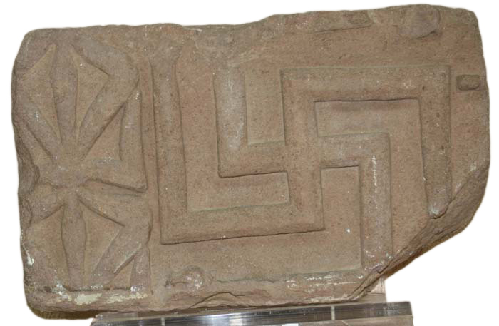 Object: Votive slab Material: Stone Date / Period: Kushana, c. 1st cent. C.E. Measurement: 26x41x8 cms. Description: Votive slab with Vajra and Swastika.